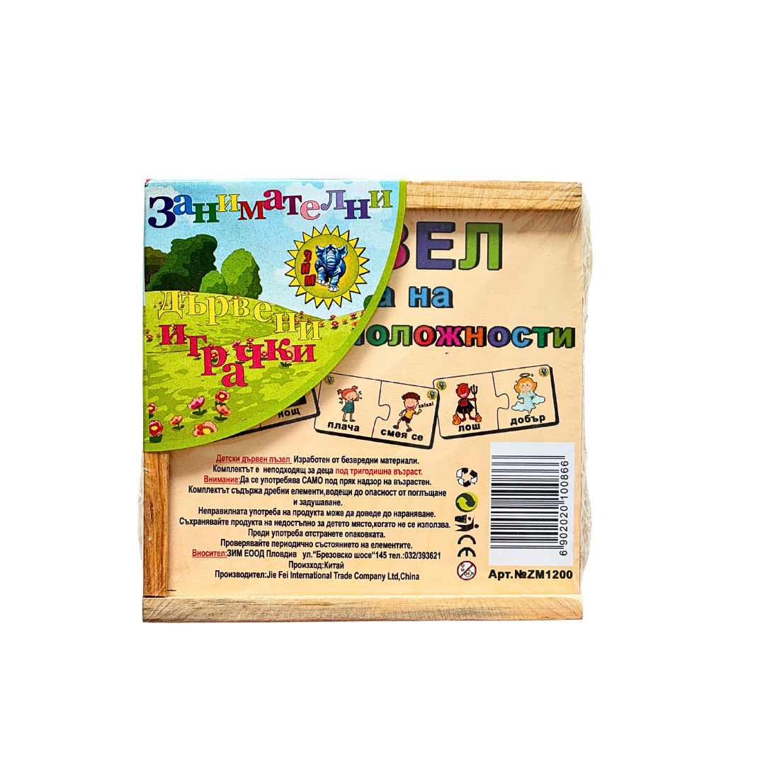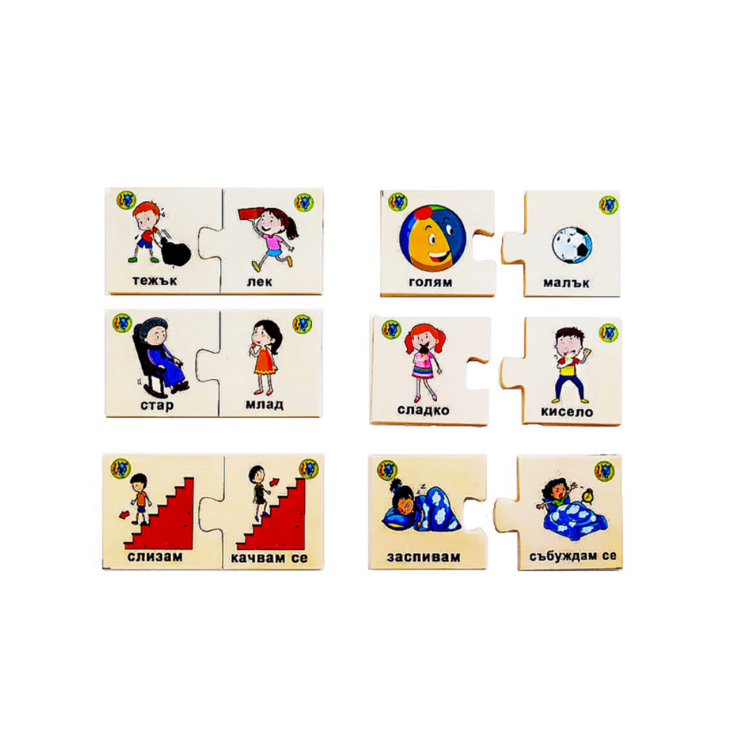 Образователният дървен пъзел „Игра на противоположности“ е създаден специално за деца над 3 години. Играта включва забавни елементи, които помагат на малчуганите да научат основни противоположности като „ден – нощ“, „смее се – плаче“, „лош – добър“ и други.