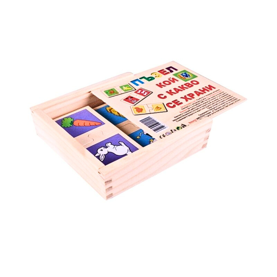 Образователен пъзел, който помага на децата да опознаят животните и храната, с която се хранят. Комплектът съдържа дървени елементи с картинки на животни и съответните им храни. Целта е детето да свърже правилно всяка двойка, като по този начин развива логическото мислене, паметта и фината моторика.