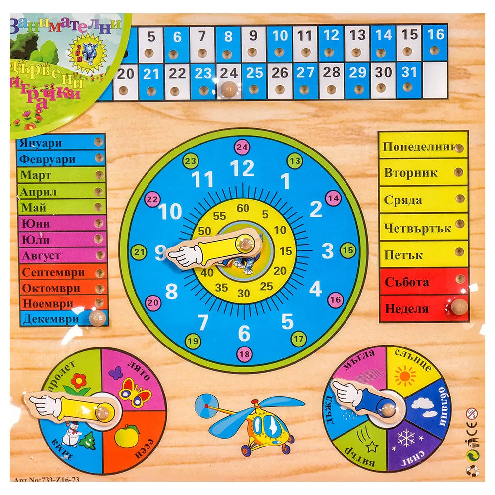 Този забавен и образователен дървен пъзел е идеалният помощник за първите стъпки в ученето. Комплектът съдържа цветна дървена дъска с часовник и въртящи се стрелки, календар с дати, дни от седмицата, месеци, сезони и метеорологични условия.